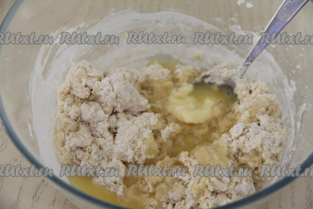 Перемешать тесто ложкой. Сливочное масло растопить, дать немного остыть. Масло должно быть тёплым, не горячим. Добавить масло в тесто.