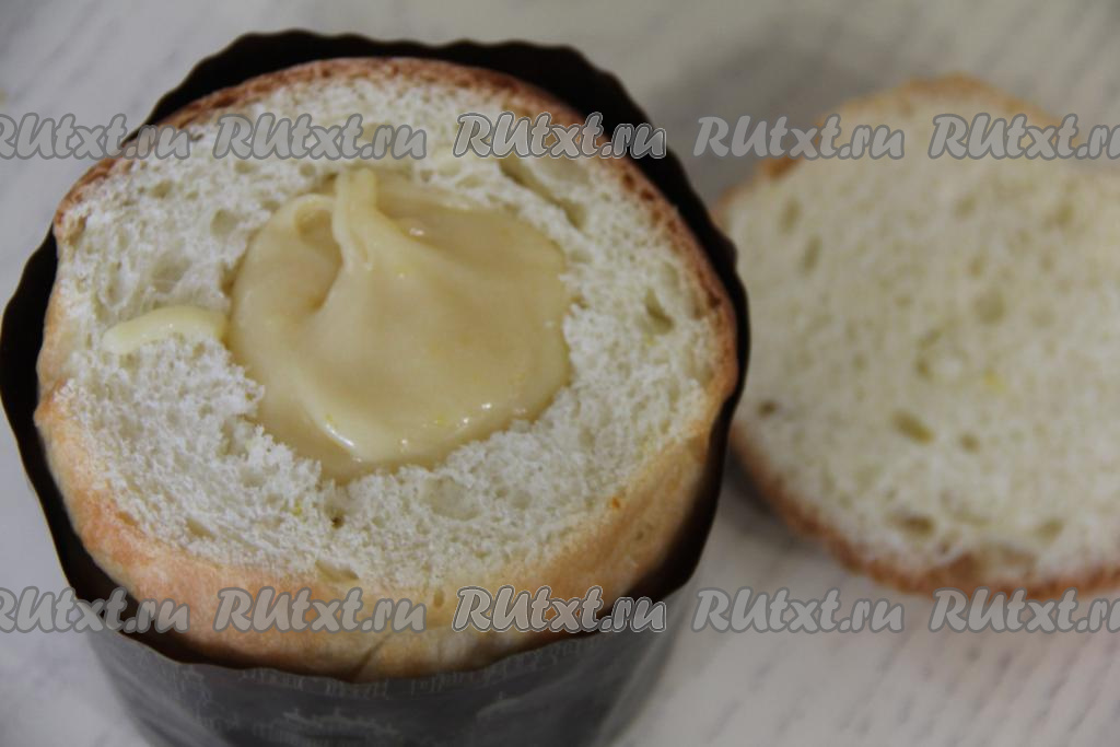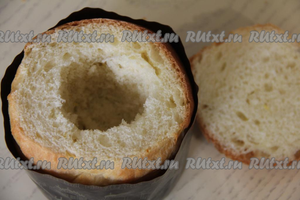 Срезать верхушки остывших куличей. С помощью ложки аккуратно достать мякиш кулича, сформировав глубокую лунку.
