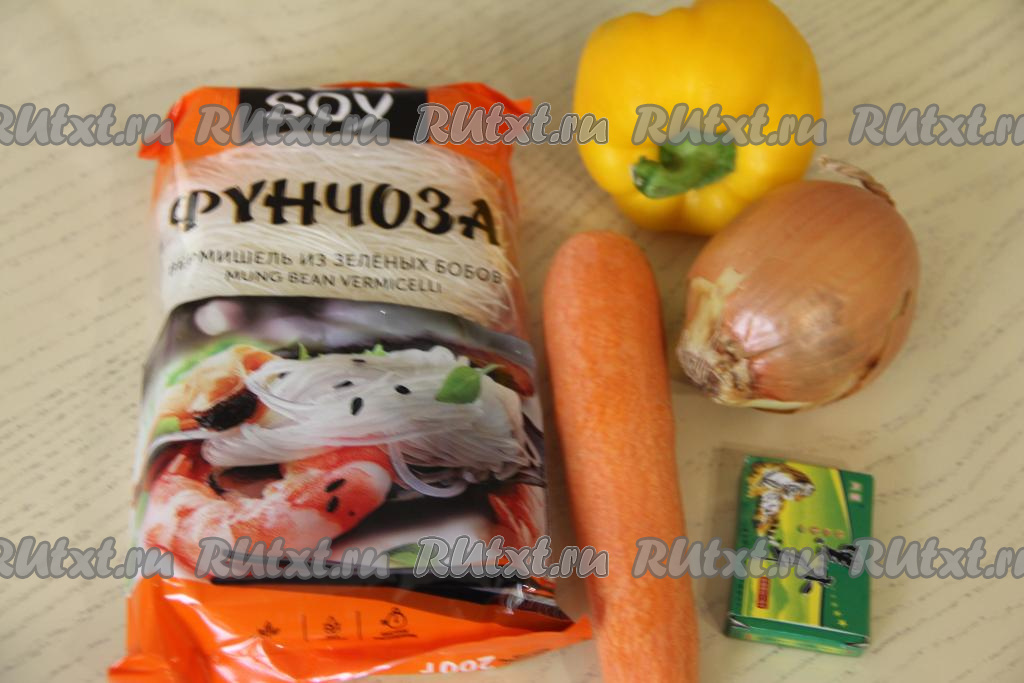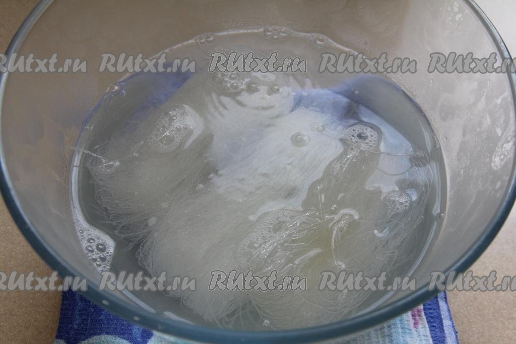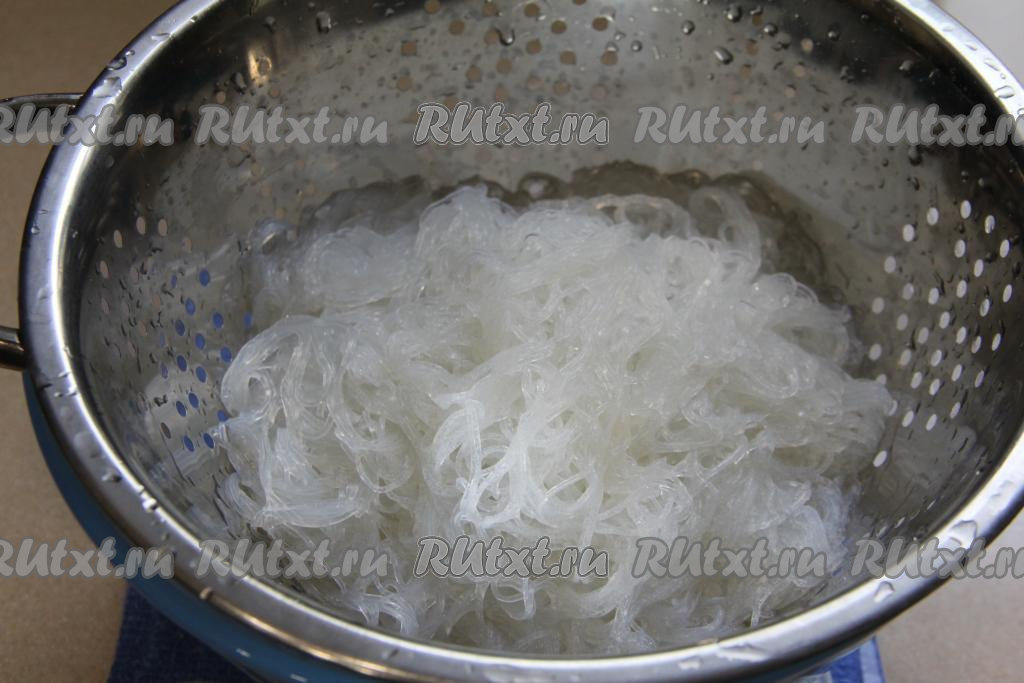 Откинуть фунчозу на дуршлаг, промыть холодной водой, лишней воде дать стечь. Нарезать фунчозу ножницами на более короткие части.