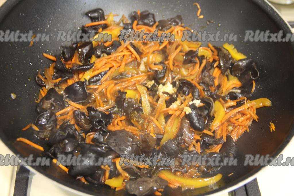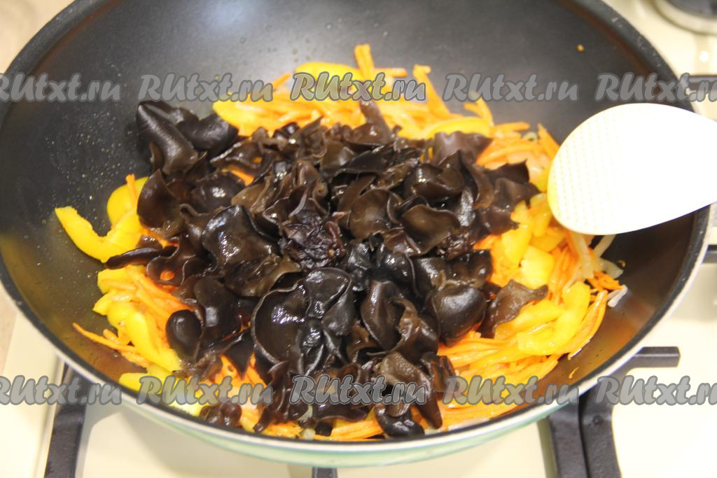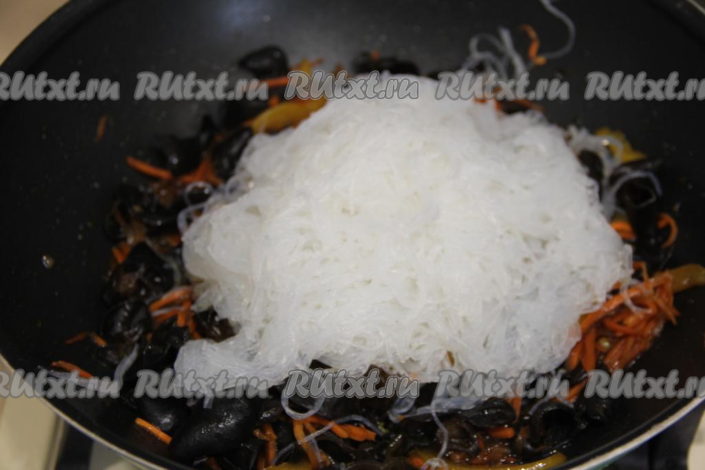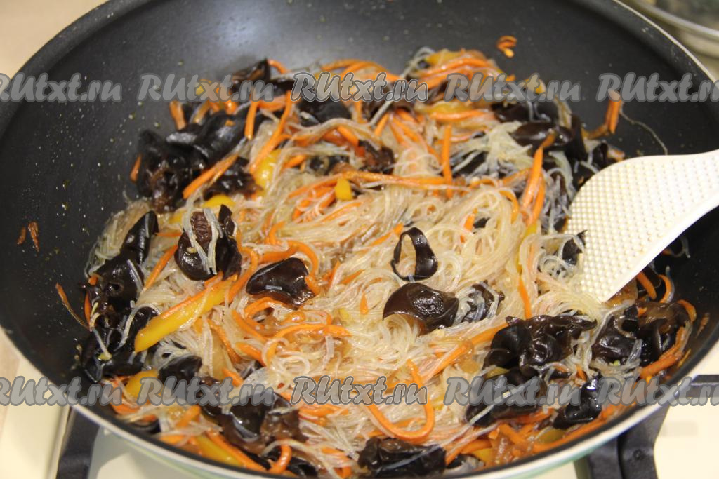 Выложить фунчозу в сковороду к древесным грибам и овощам.