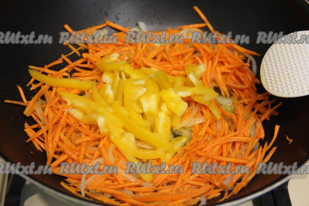 Обжарить морковь с луком в течение 5-7 минут (до мягкости морковки), время от времени перемешивая овощи. Затем добавить болгарский перец, нарезанный на длинные полоски, перемешать.