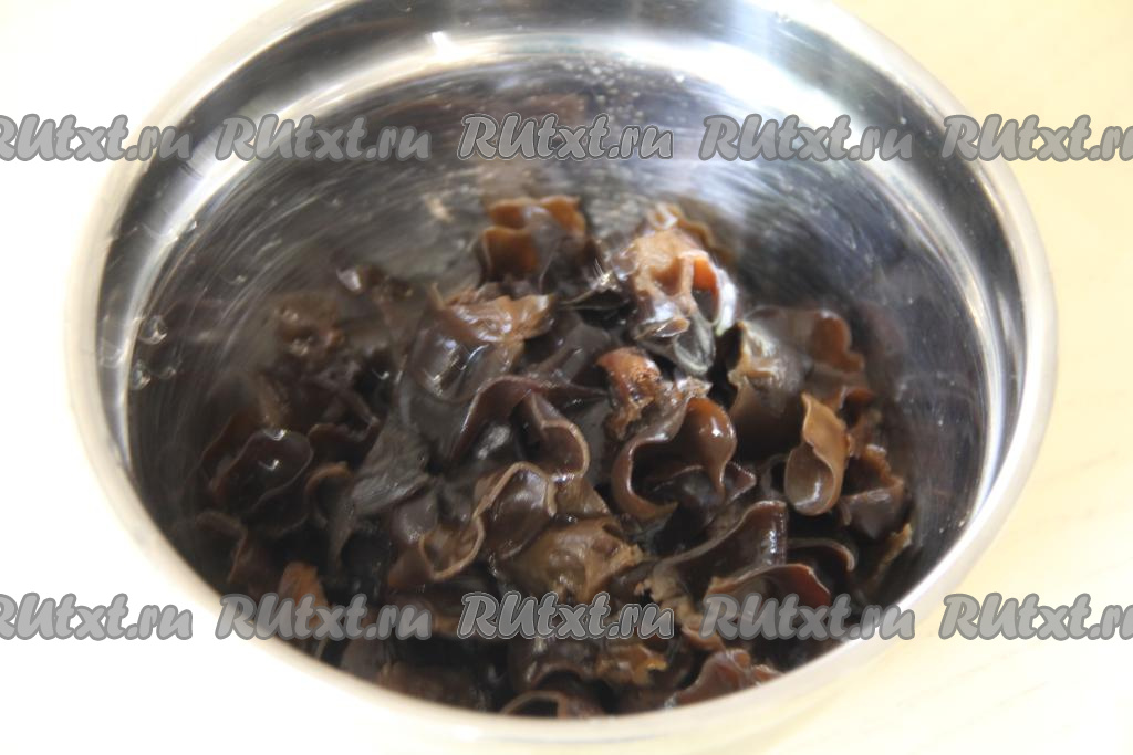 Покупные грибы муэр освободить от плёнки и залить 1 литром тёплой воды, оставить на 1 час при комнатной температуре.
