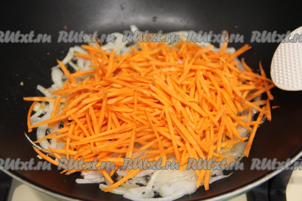 В глубокую сковороду влить растительное масло, хорошо его разогреть. Лук нарезать на полукольца и обжарить в течение 4 минут на среднем огне, иногда помешивая. Морковь натереть на тёрке для корейской моркови (или на крупной тёрке) и добавить в сковороду, перемешать.