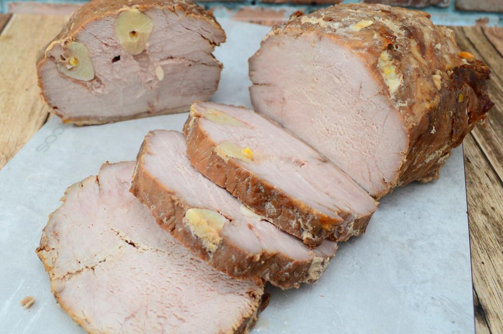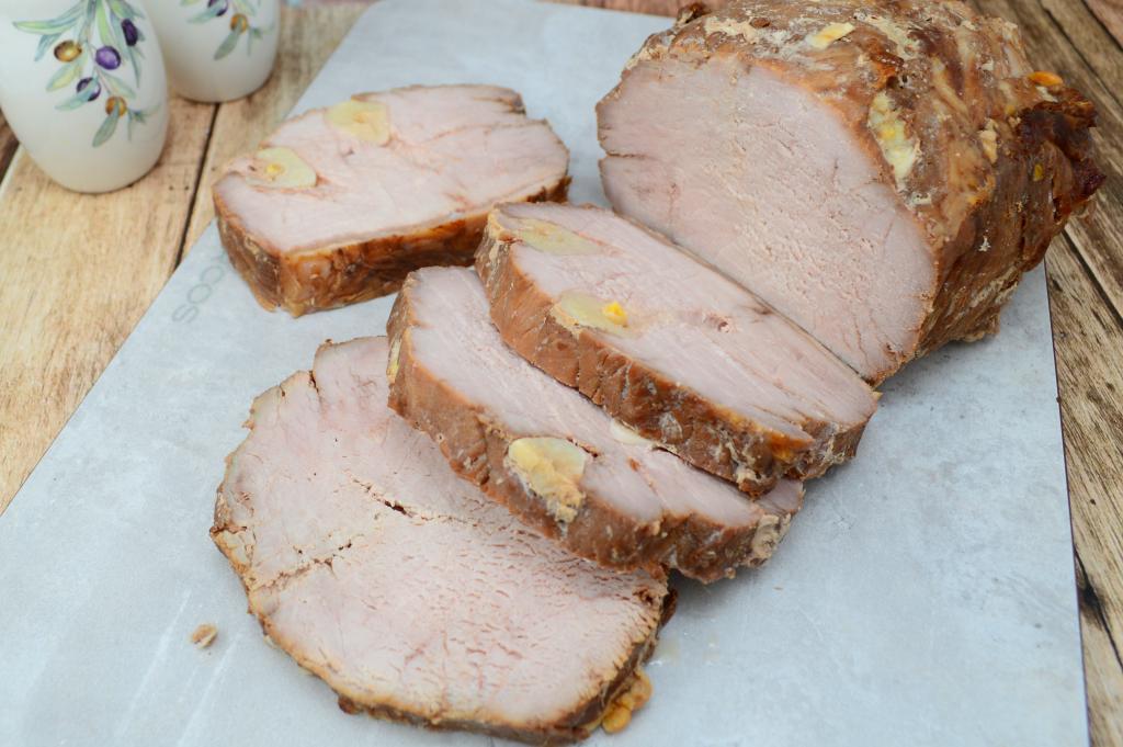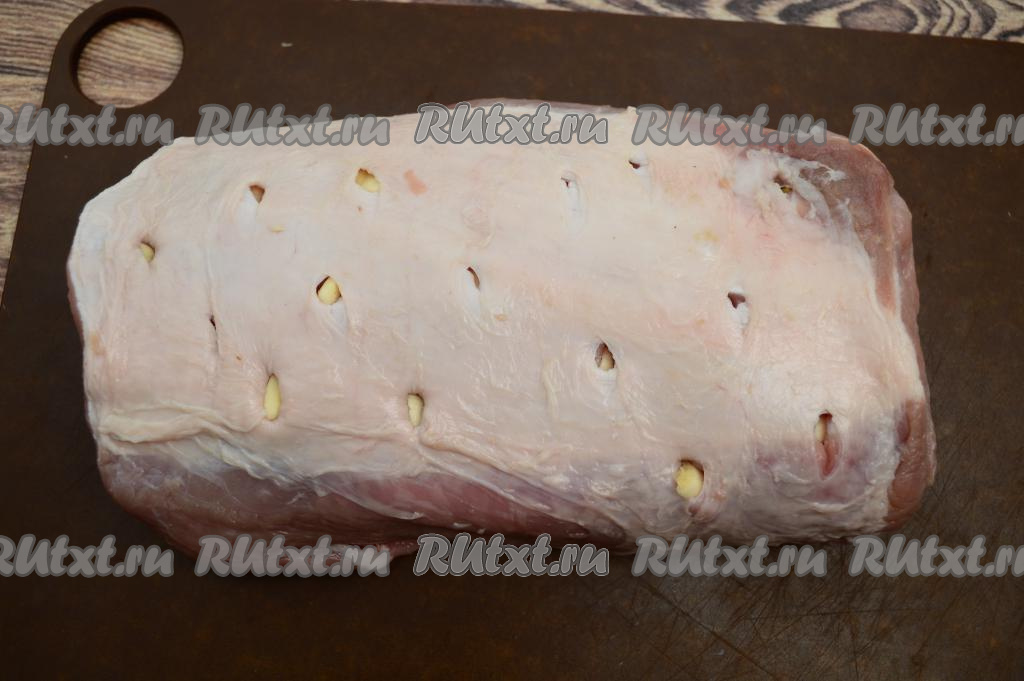 Глубокие надрезы нужно сделать со всех сторон карбоната, не забывая вставлять в каждый надрез по пластине чеснока.