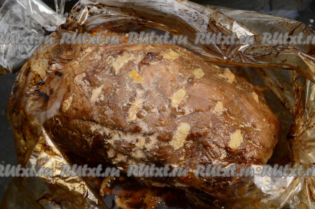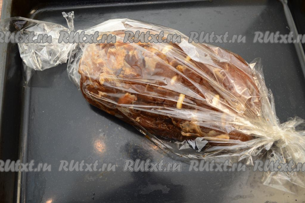 Достать противень с мясом из духовки, аккуратно разрезать рукав для запекания.