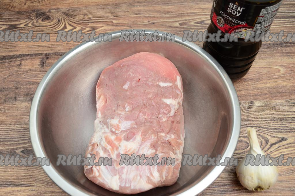 Выложить мякоть свинины в глубокую миску, полить мясо соевым соусом. Несколько раз перевернуть кусок мяса, чтобы он равномерно покрылся соевым соусом. Накрыть миску с мясом и убрать мариноваться минимум на 2 часа в холодильник (можно оставить на ночь). Соевый соус не весь впитается в мясо, часть будет внизу миски.