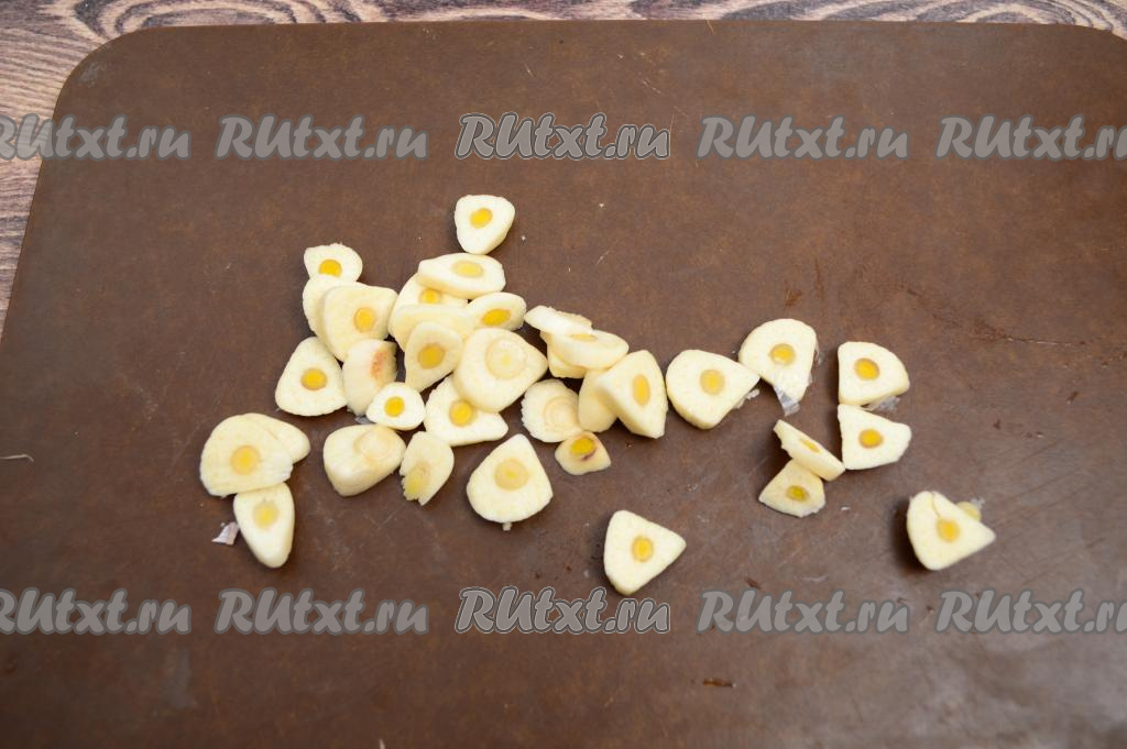 Чеснок очистить и нарезать на пластины толщиной 2-3 миллиметра.