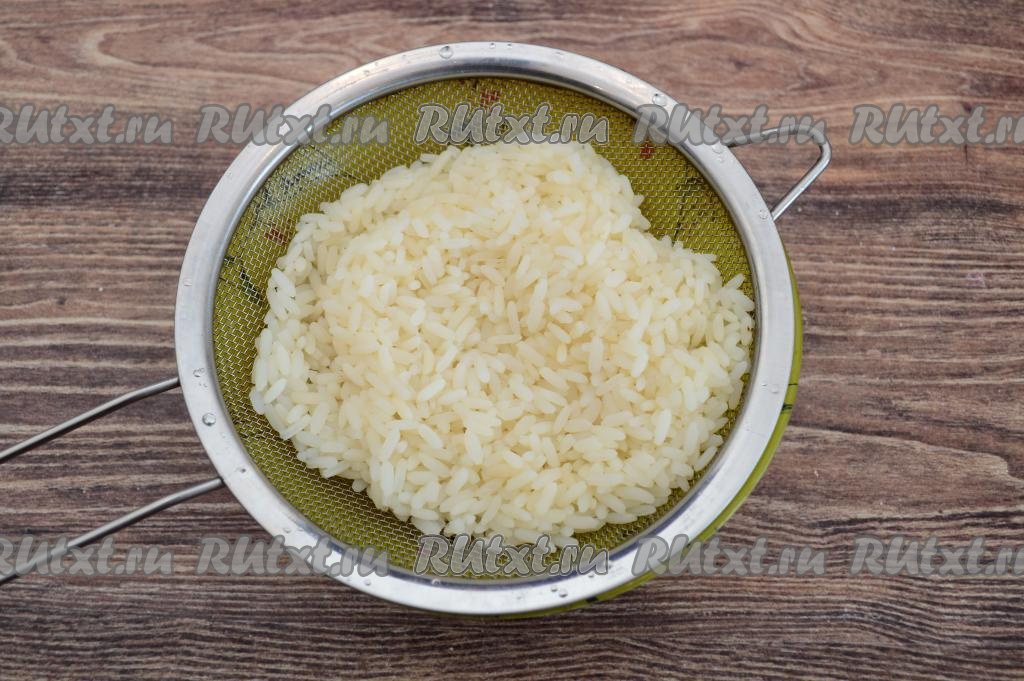 В кастрюлю, в которой будете варить рис, влить миллилитров 300 воды, поставить на огонь. Пока вода в кастрюле закипает, насыпать в сито рис, хорошо промыть под проточной водой. В кастрюлю с закипевшей водой выложить подготовленный рис, перемешать, снова дать воде закипеть, уменьшить огонь. Отварить рис до готовности (на варку обычно требуется минут 20, рисинки должны стать мягкими). Сварившийся рис откинуть на сито, оставить на несколько минут, чтобы с него стекла лишняя жидкость и он остыл.