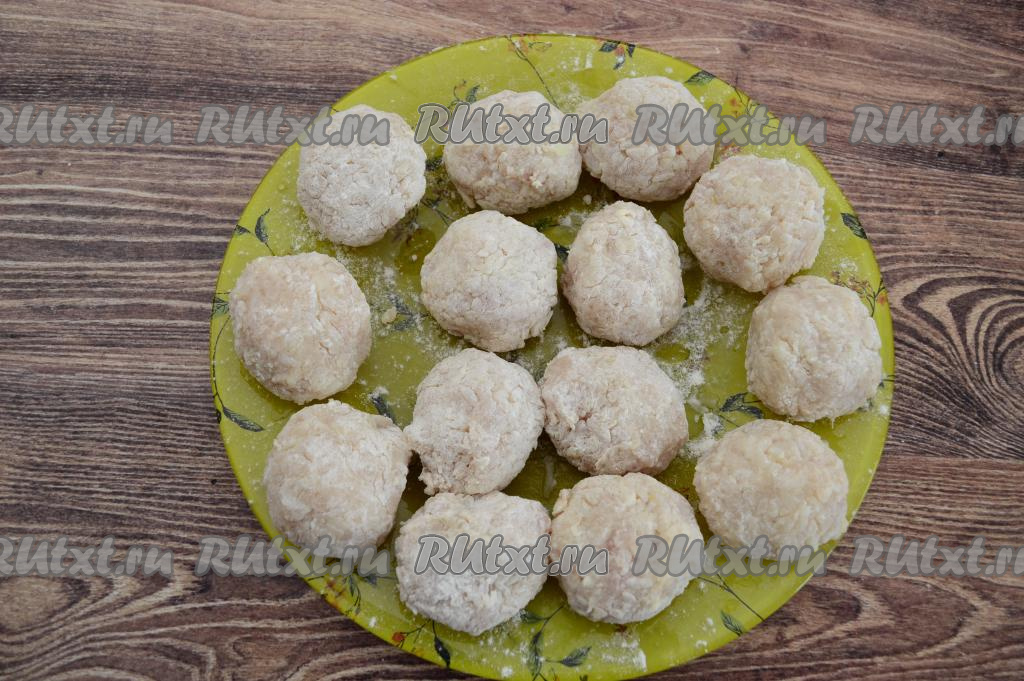 В глубокую тарелку насыпать муку. Руками, смоченными водой, сформировать из фарша круглые тефтели (я сформировала 14 тефтелей размером чуть больше грецкого ореха). Обвалять каждую тефтелю со всех сторон в муке.