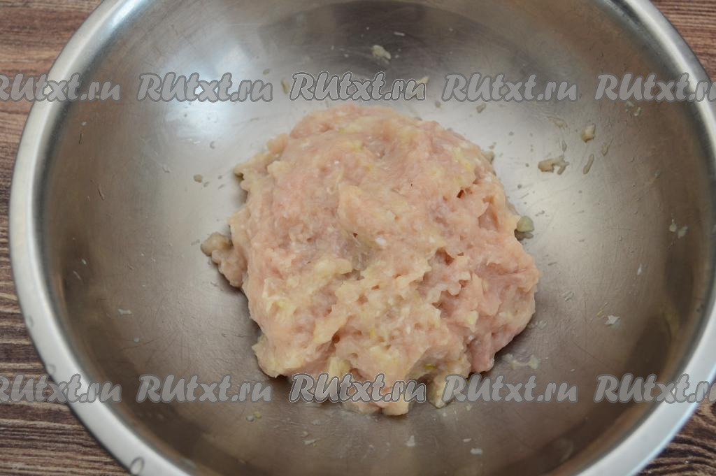 Пропустить мясо и лук через мясорубку (или пробить до однородности в измельчителе).