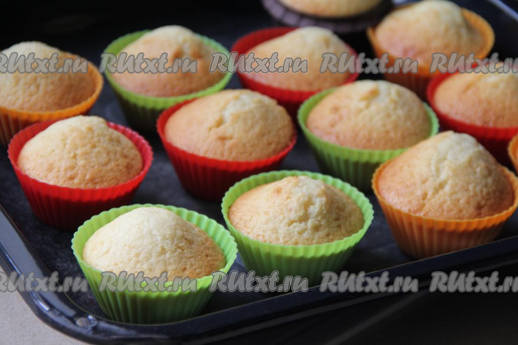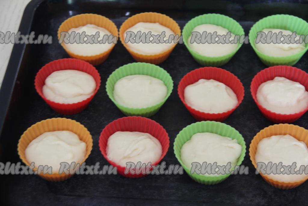 Разложить тесто по силиконовым формам, заполняя их примерно на 2/3 объёма. Переставить формочки на противень и отправить в разогретую до 180 градусов духовку. Выпекать кексы на ряженке минут 25.