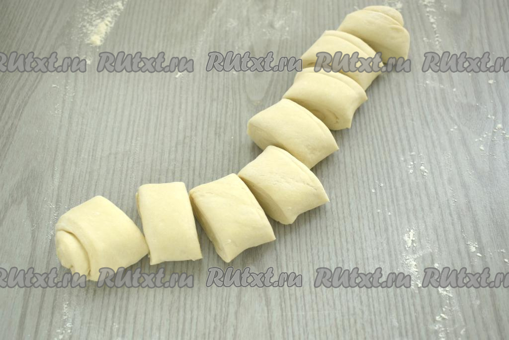 Размороженный пласт слоёного теста на присыпанной мукой поверхности сворачиваем в достаточно плотный рулет (если у вас прямоугольный пласт теста, тогда его нужно сворачивать в рулет, начиная с широкой стороны). Разрезаем рулет из слоёного теста на 8 одинаковых частей.