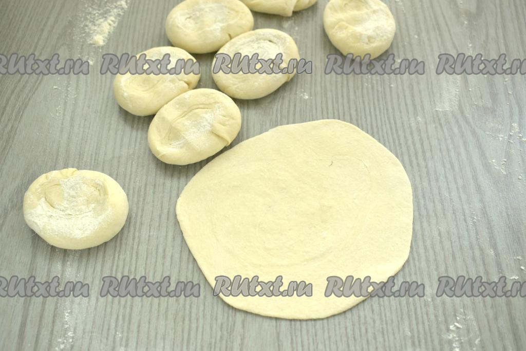 Каждый кусочек теста переворачиваем на срез, прижимаем сверху ладонью и раскатываем скалкой в лепёшку диаметром примерно 10-12 сантиметров.