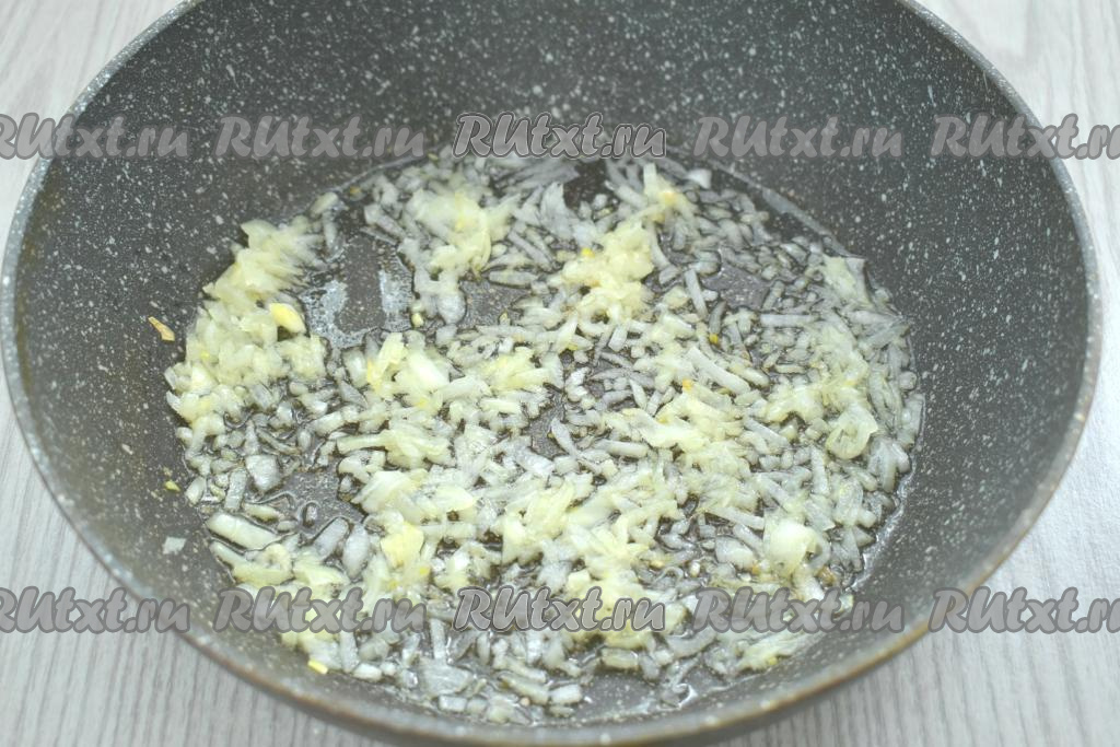 К обжаренному луку добавляем шампиньоны (или предварительно отваренные лесные грибы), нарезанные на небольшие кубики, перемешиваем. Обжариваем лук с грибами минут 6-7 (до выпаривания жидкости из грибов), иногда перемешивая. Солим грибы, обжариваем 1 минуту. Убираем с огня.
