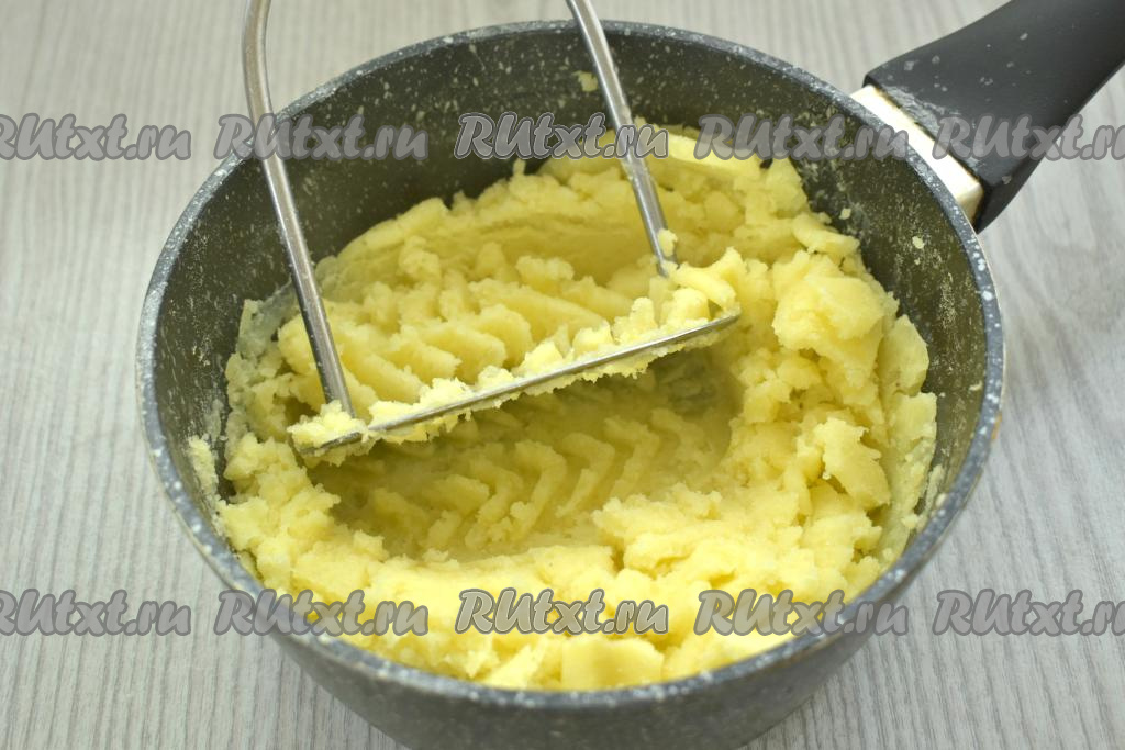 После того как картофель отварится до готовности, сливаем воду, в которой он варился. Разминаем картошку толкушкой до получения однородного пюре.
