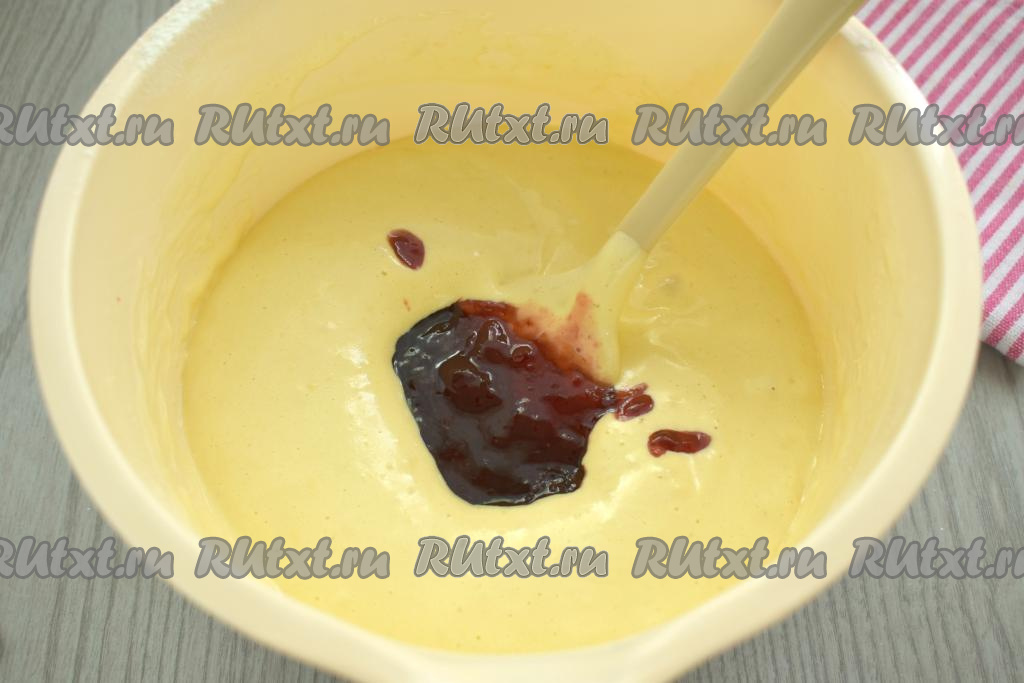 В бисквитное тесто добавляем 3-4 столовых ложки варенья, перемешиваем лопаткой (или ложкой).