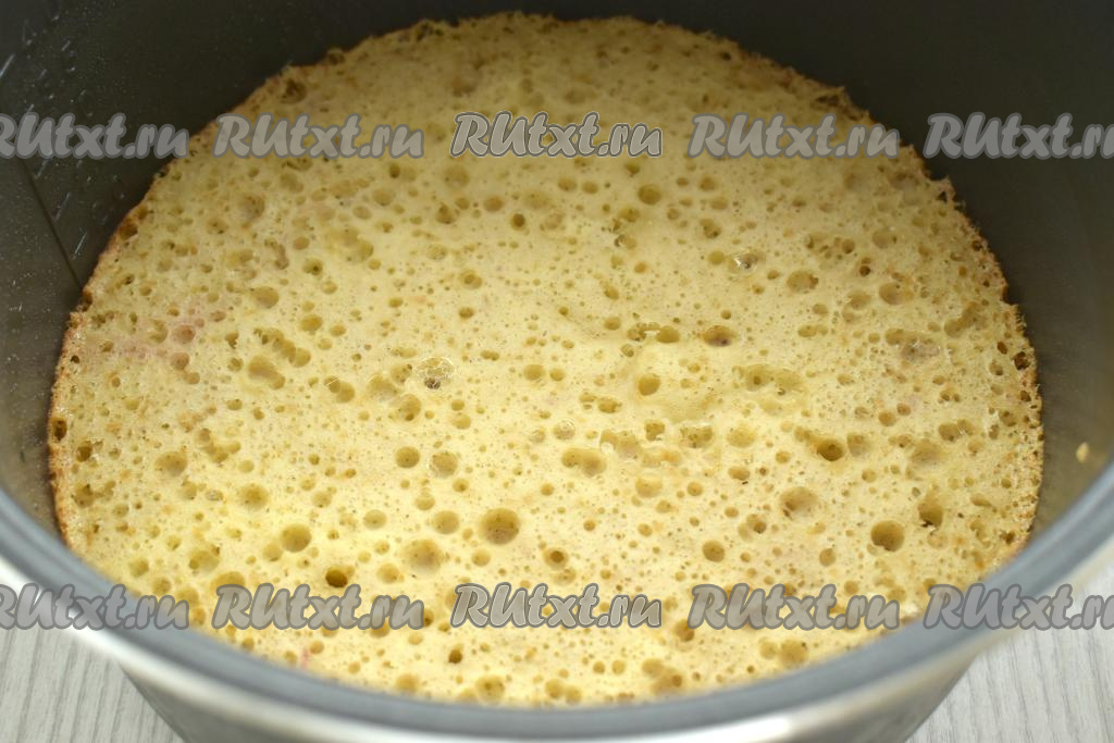 Закрываем крышку мультиварки, включаем режим "Выпечка" на 50 минут. Готовность бисквита проверяем, проколов его сухой зубочисткой, если после прокола на зубочистке не будет следов теста, значит выпечка готова.