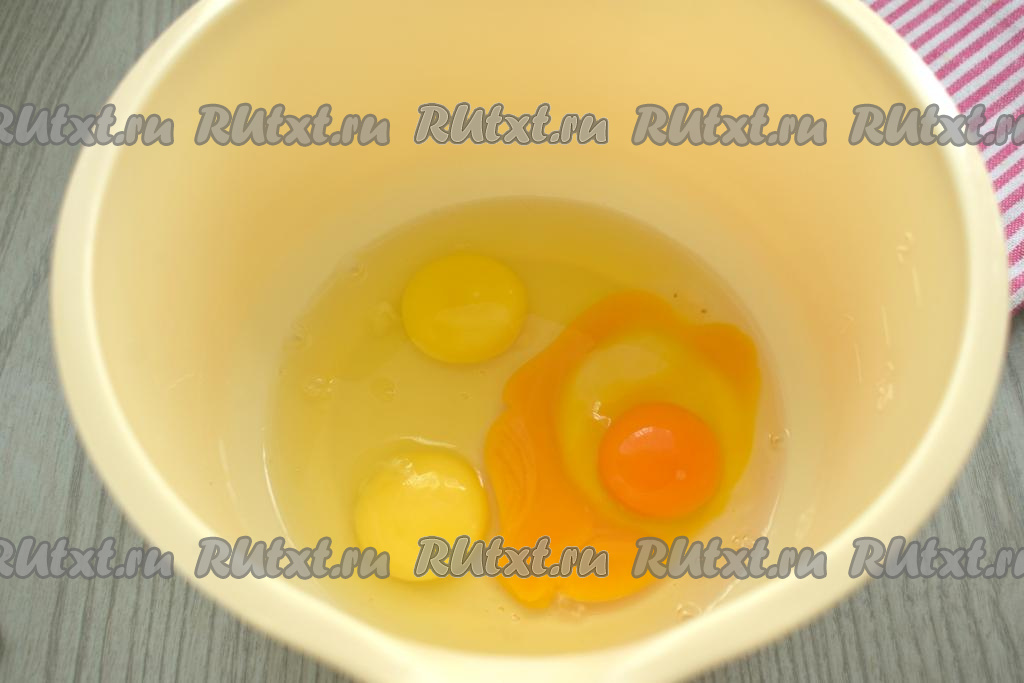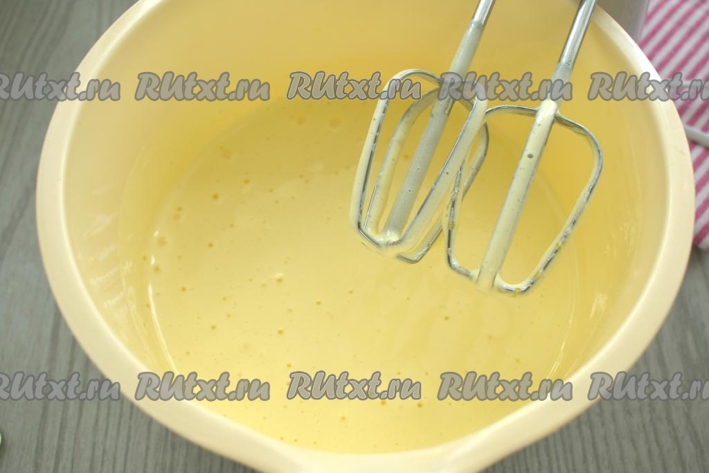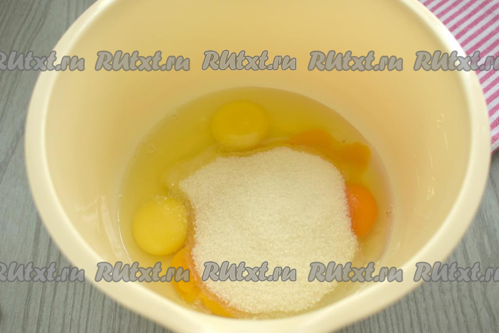 Взбиваем яйца с сахаром в течение 5-6 минут (до получения светлой, пышной массы) на максимальной скорости миксера. Миксер убираем, он нам больше не потребуется.