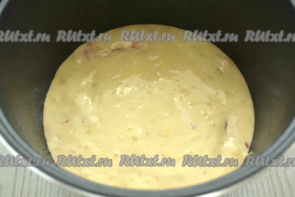 Дно и бока съёмной чаши мультиварки смазываем растительным маслом, затем выкладываем замешанное бисквитное тесто с вареньем.