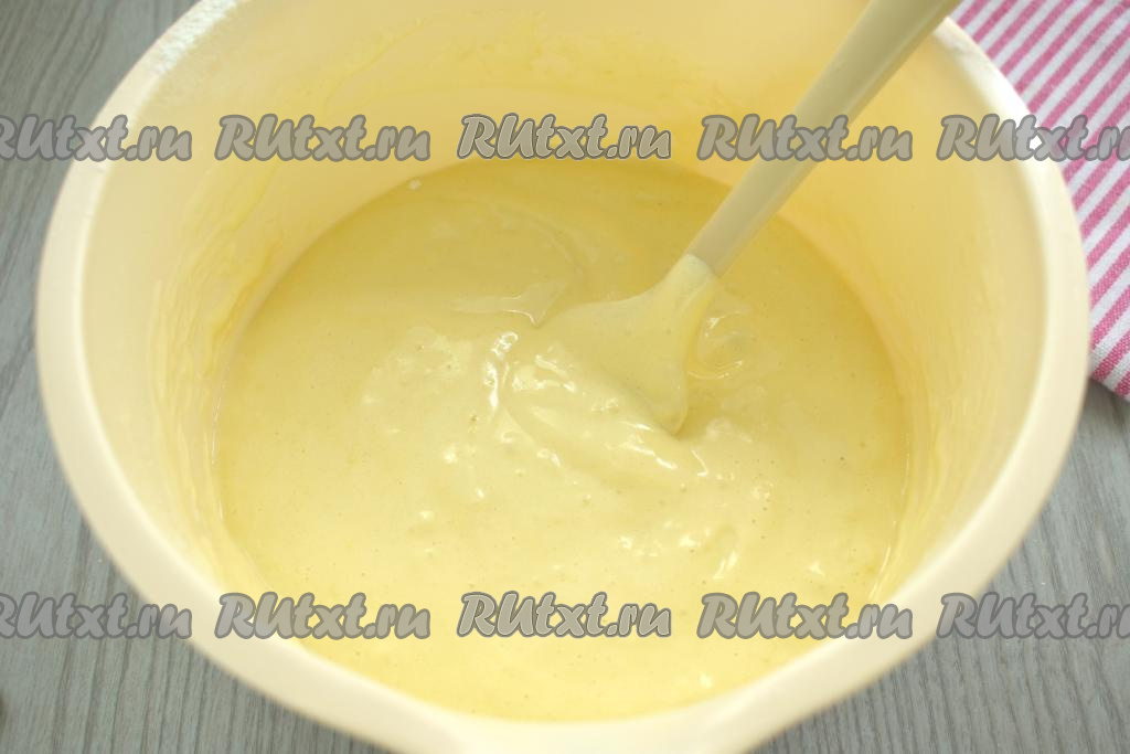 Понемногу всыпая оставшуюся просеянную муку и вмешивая её, замешиваем нежное, в меру вязкое, однородное тесто. По консистенции тесто должно напоминать сметану средней густоты, оно будет широкой лентой стекать с лопатки. Как только тесто стало нужной густоты, значит больше муки добавлять не надо.