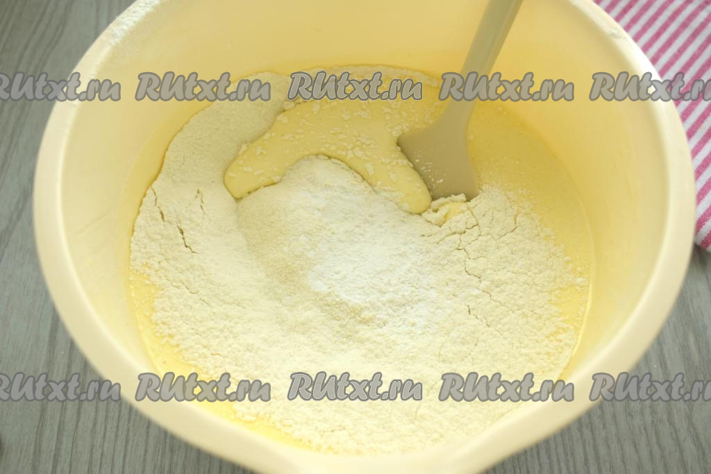 Во взбитую яичную массу всыпаем разрыхлитель и грамм 70 просеянной муки, перемешиваем бисквитное тесто лопаткой (или столовой ложкой), полностью вмешивая муку, но при этом стараясь не сбить воздушность взбитых яиц.