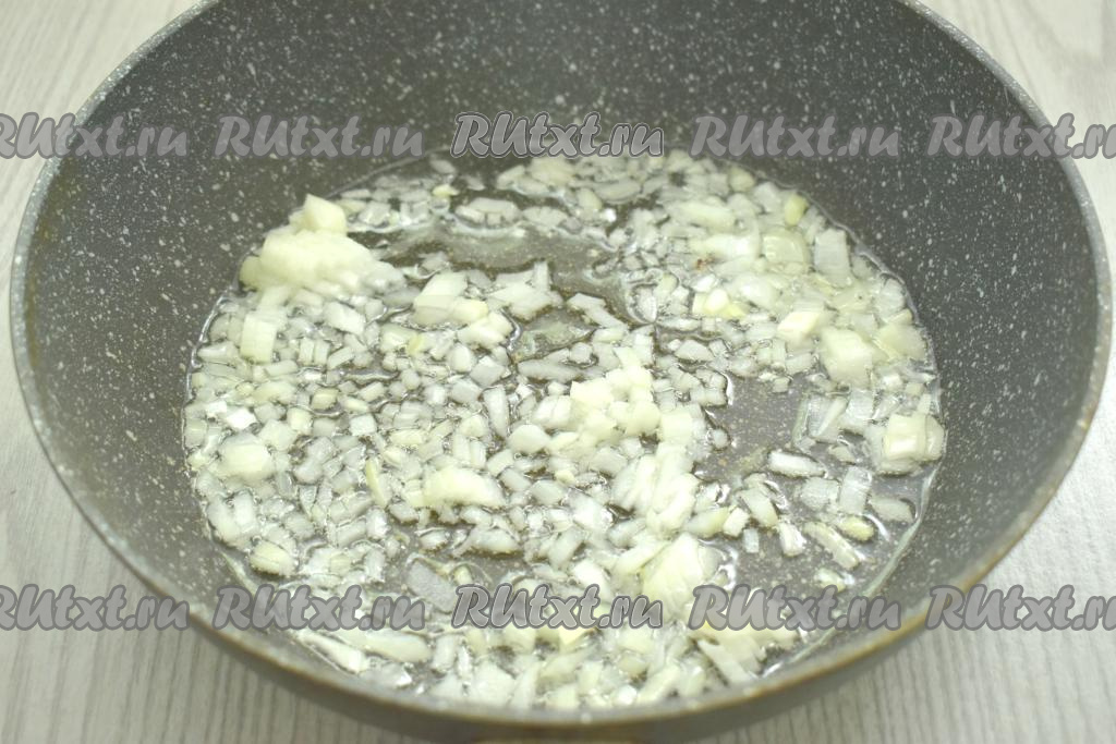 Для получения фарша нужно взять куски любого мяса (в этот раз у меня свинина) и пропустить их через мясорубку. Можно использовать и покупной фарш. Очищаем лук и морковь. Лук нарезаем на небольшие кусочки. В сковороде разогреваем растительное масло, выкладываем лук и на среднем огне обжариваем его до прозрачности (минуты 3-4), иногда перемешивая.