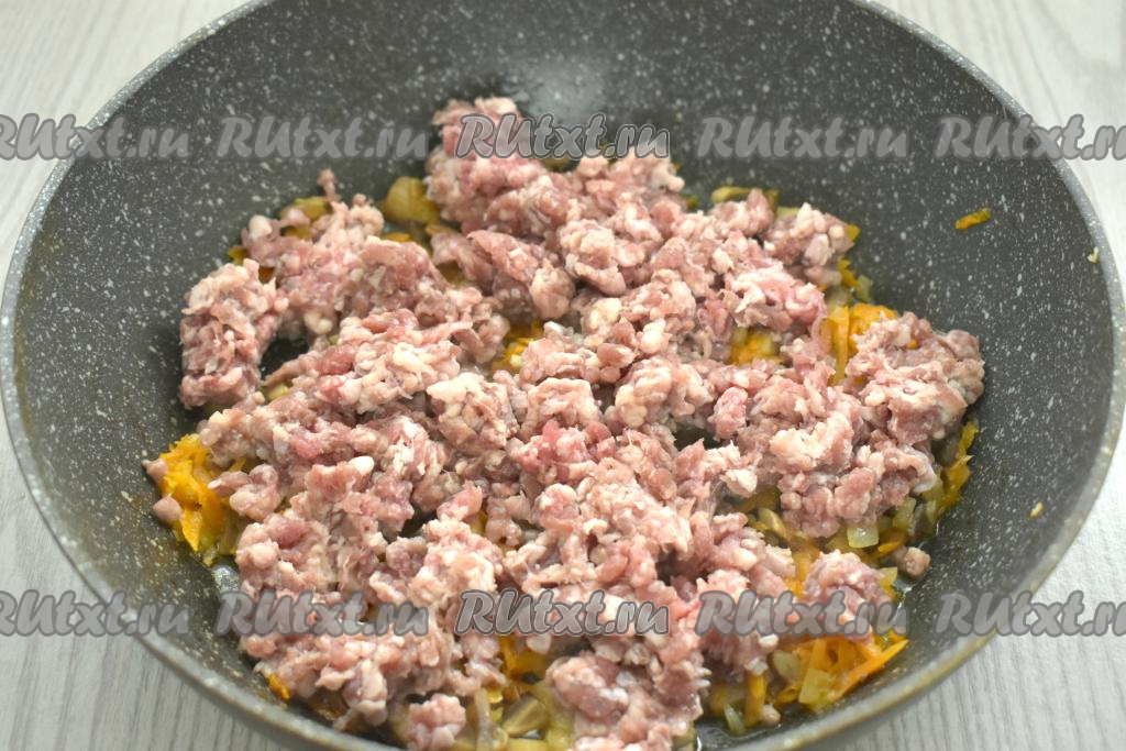 К обжаренным овощам выкладываем мясной фарш, перемешиваем, обжариваем 6-8 минут (до изменения цвета фарша со всех сторон), часто разбивая комочки мяса.