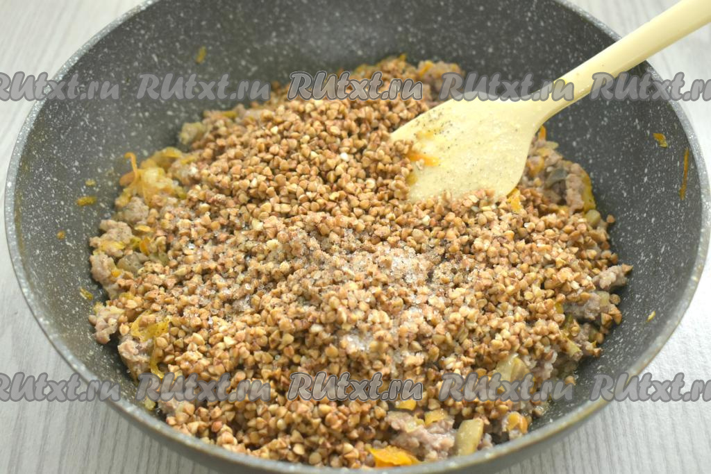Заранее гречку, если необходимо, перебираем. Выкладываем гречку в сито и тщательно промываем под проточной водой, затем лишней воде даём стечь. После того как фарш изменит цвет, добавляем гречку в сковороду, солим, перчим, перемешиваем и выключаем огонь.