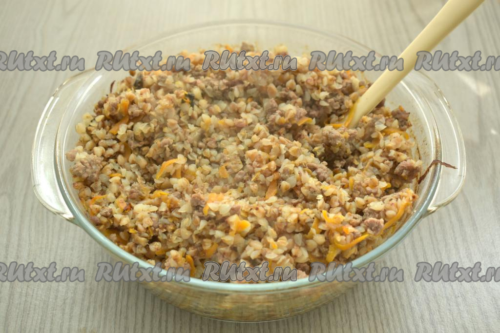 Форму, не накрывая крышкой (или фольгой), ставим в прогретую до 180 градусов духовку, готовим гречку по-купечески с фаршем 35-40 минут (до выпаривания воды и мягкости гречки). За это время 3 раза нужно блюдо перемешать, чтобы сверху не появилась плотная корочка.