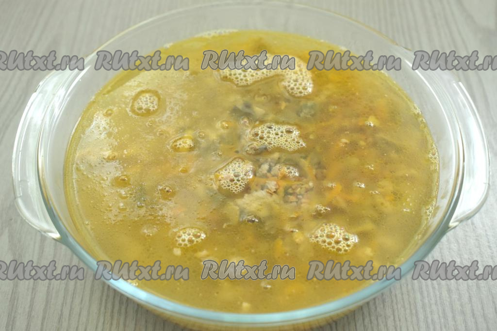 Гречку с фаршем, морковкой и луком перекладываем в подходящую форму для запекания, вливаем 625 миллилитров горячей воды.