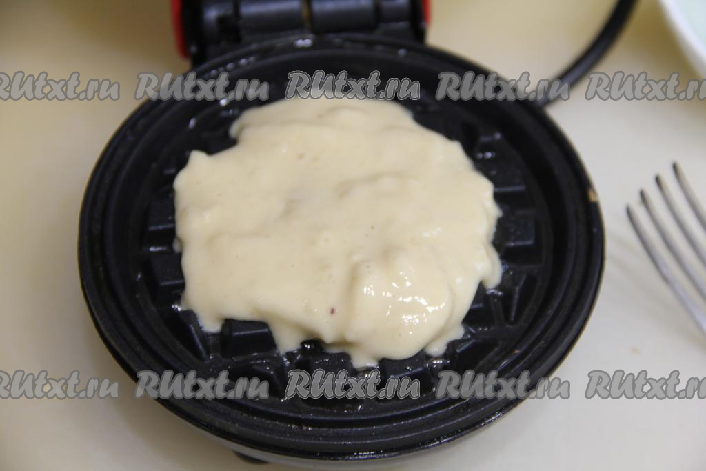 Тесто для вафель с бананом и яблоком должно получиться в меру густым, напоминающим сметану средней жирности. Если у вас получилось жидковатое тесто, тогда добавьте немного муки, добиваясь нужной консистенции теста.