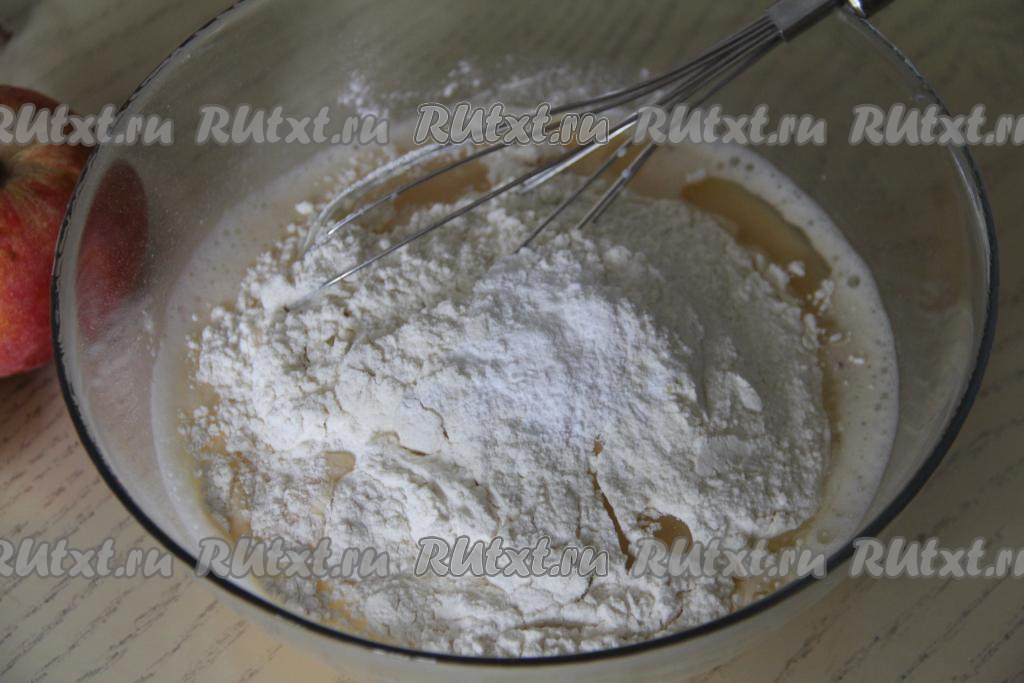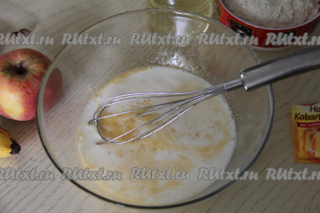 Перемешать массу венчиком, влить молоко и растительное масло, ещё раз перемешать.