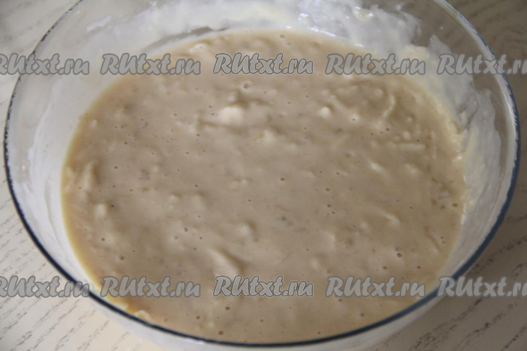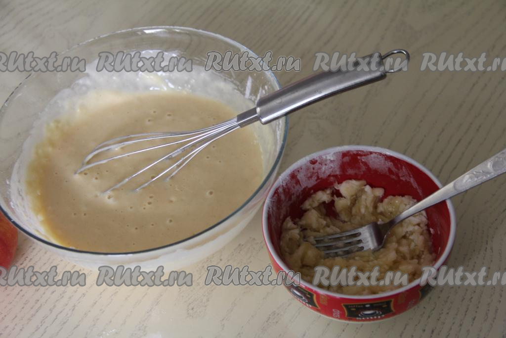 Добавить мякоть банана в тесто, перемешать венчиком.