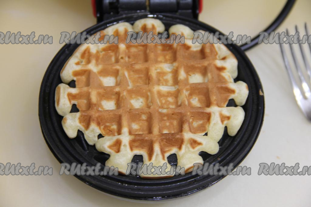 Вафельницу хорошо разогреть, по желанию, смазать створки вафельницы растительным маслом. Выложить примерно 1,5 столовых ложки теста, закрыть створки вафельницы.