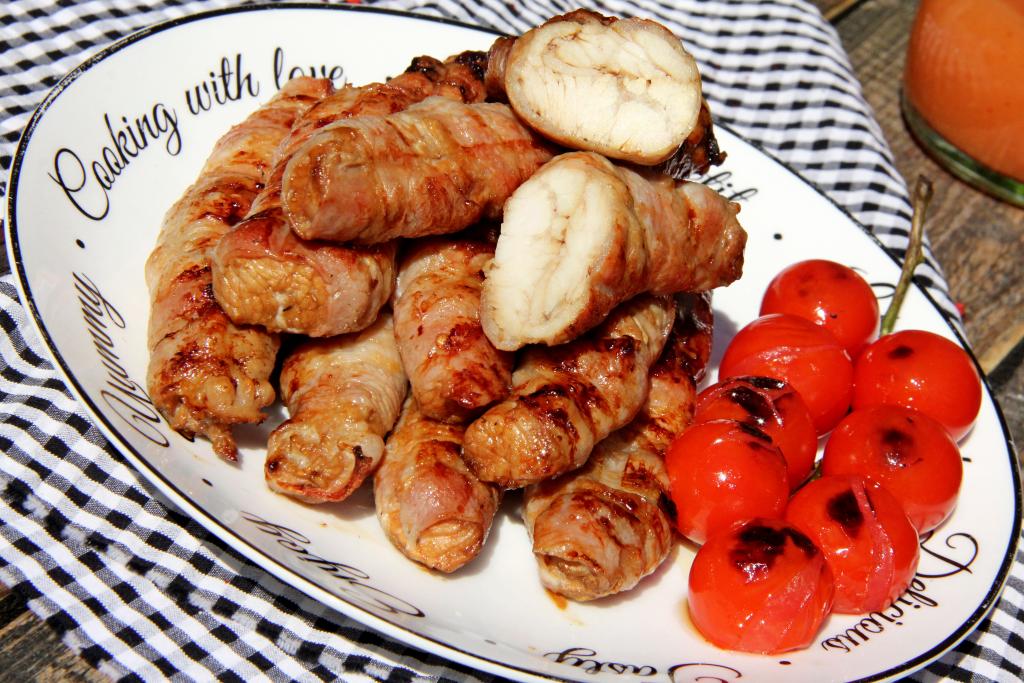 Готовые аппетитные, ароматные, сочные рулетики из индейки в беконе снять с мангала, переложить на тарелку и сразу же подать к столу.