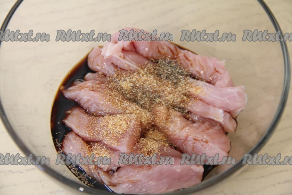 Переложить брусочки индейки в миску, добавить соевый соус и специи (в качестве специй я добавила 1 чайную ложку сушёного чеснока, можете использовать свои любимые специи для мяса). Солить кусочки индейки не надо, так как соевый соус достаточно солёный.