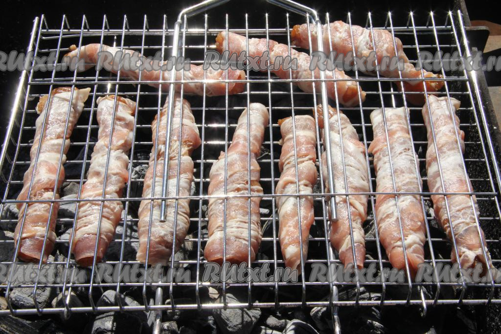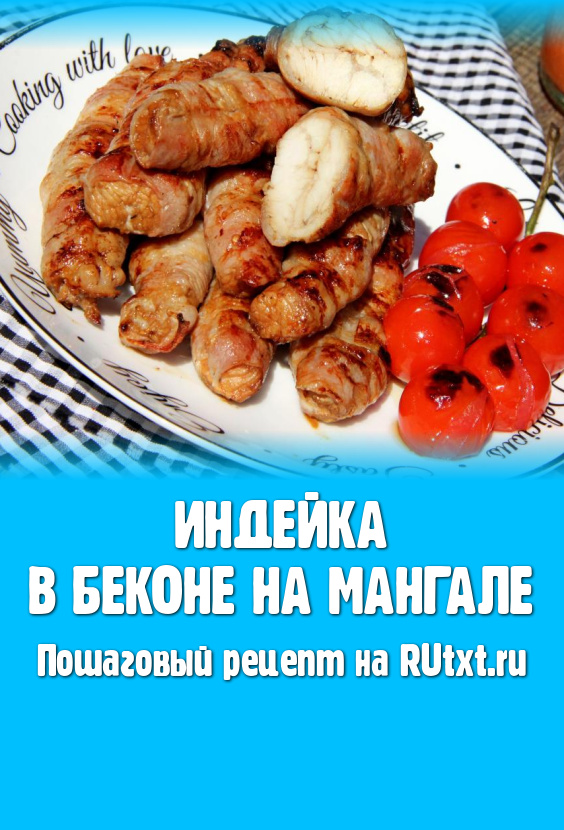 Индейку в беконе жарить следует на седых углях, не допуская прямого пламени и часто переворачивая решётку. Примерное время приготовления 20 минут. Бекон должен стать золотистого цвета. Продолжительность приготовления зависит от жара углей, поэтому ориентируйтесь не на время, а на цвет рулетиков. Также можно проверить готовность мяса, разрезав один рулет ножом. Если надрез индейки без розовых вкраплений, значит мясо готово, можно снимать с огня
