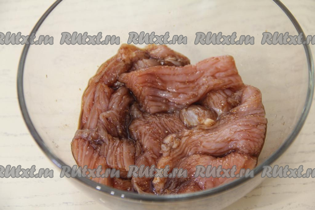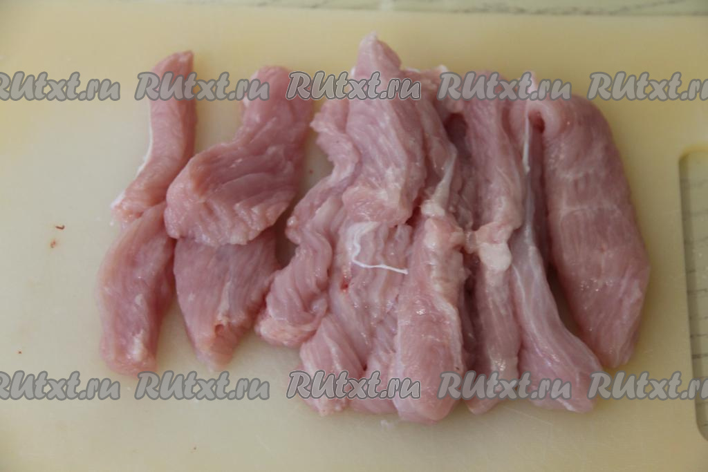 Нарезать мякоть индейки на длинные брусочки.