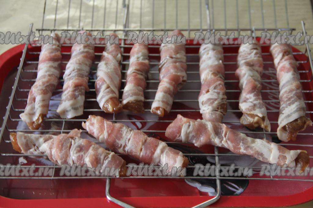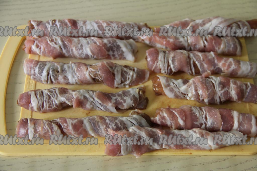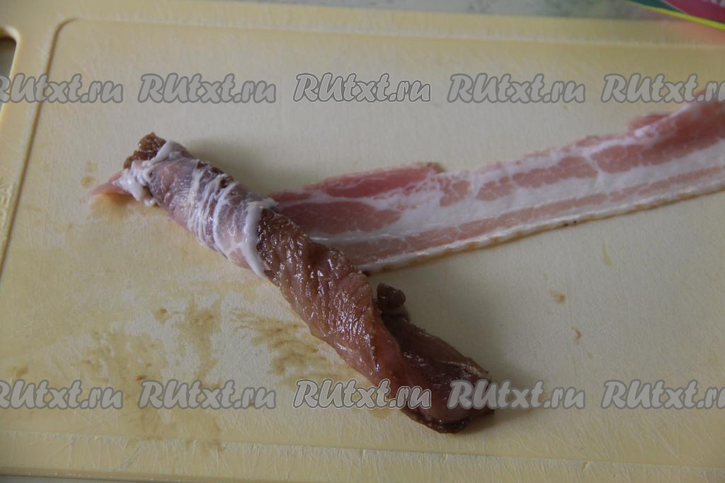 Каждый кусочек индейки, замаринованной в соевом соусе, завернуть в полоску бекона. Оборачивать бекон вокруг мяса нужно так, чтобы полоска бекона ложилась внахлёст.