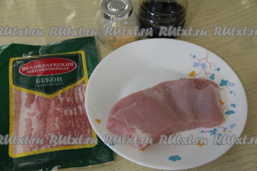 Подготовить продукты. Филе индейки промыть водой и обсушить. Бекон я взяла сырокопчёный, уже нарезанный на полоски.