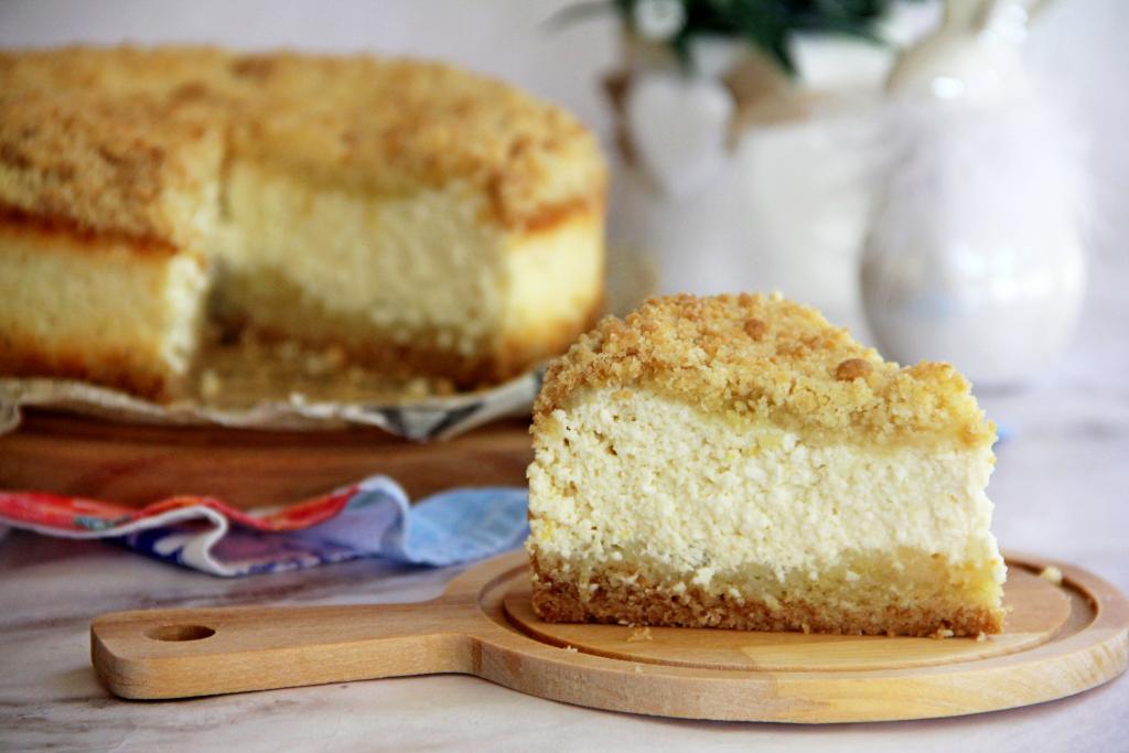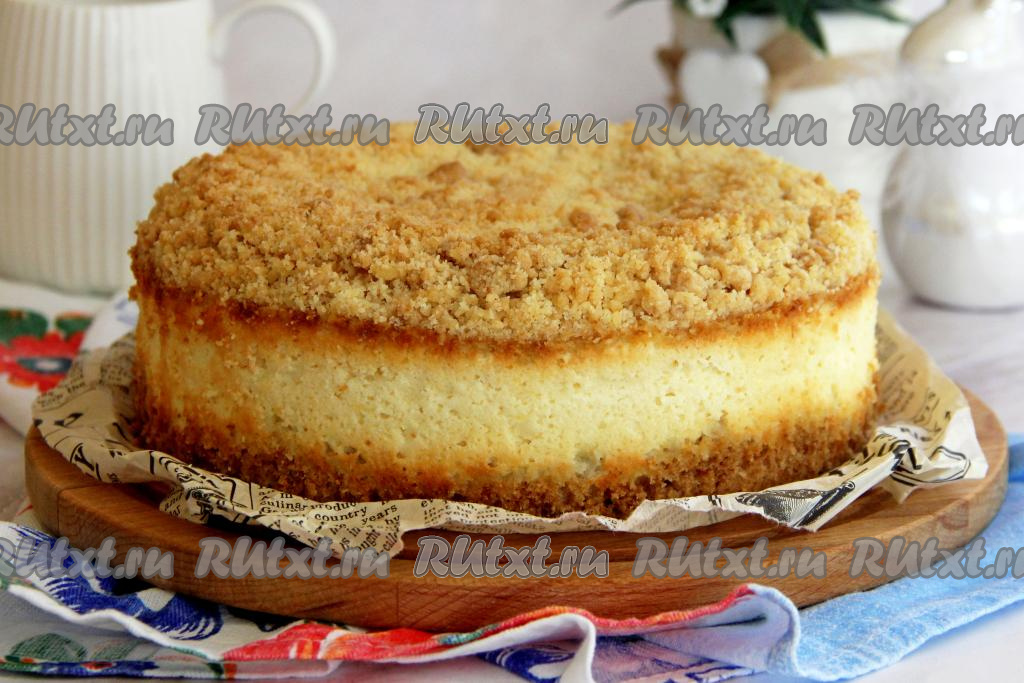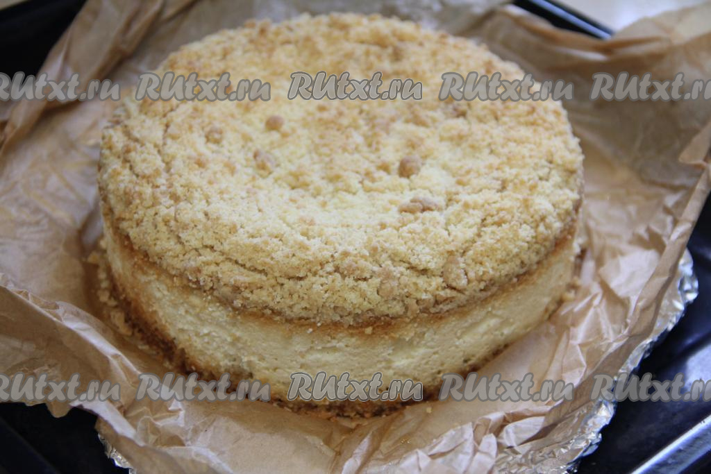 Поверх творожной начинки равномерно распределить оставшееся тесто-крошку, закрывая всю начинку.