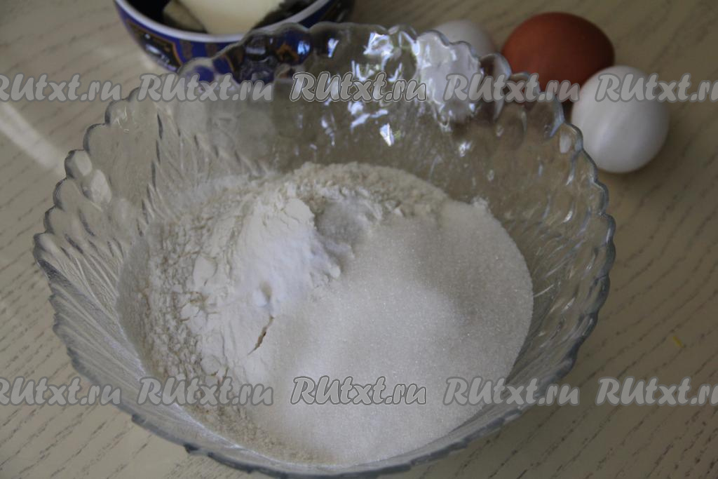 Отдельно приготовить песочное тесто-крошку. Для этого в отдельной миске нужно соединить муку, сахар, соль и соду.