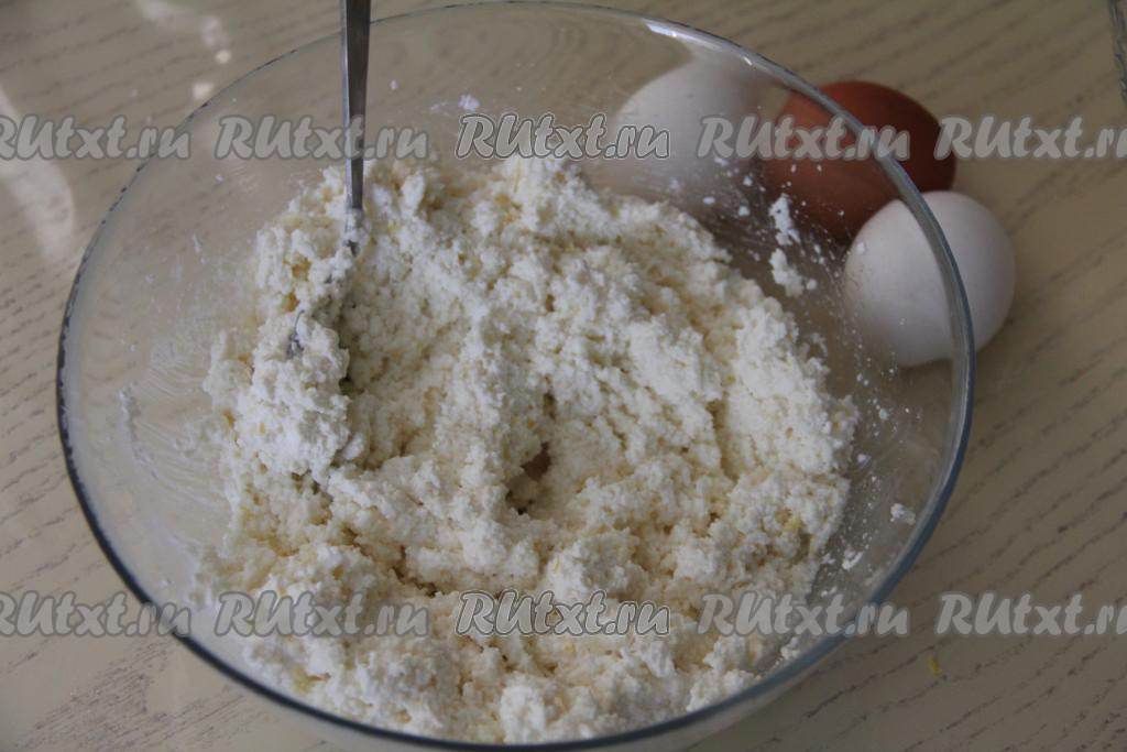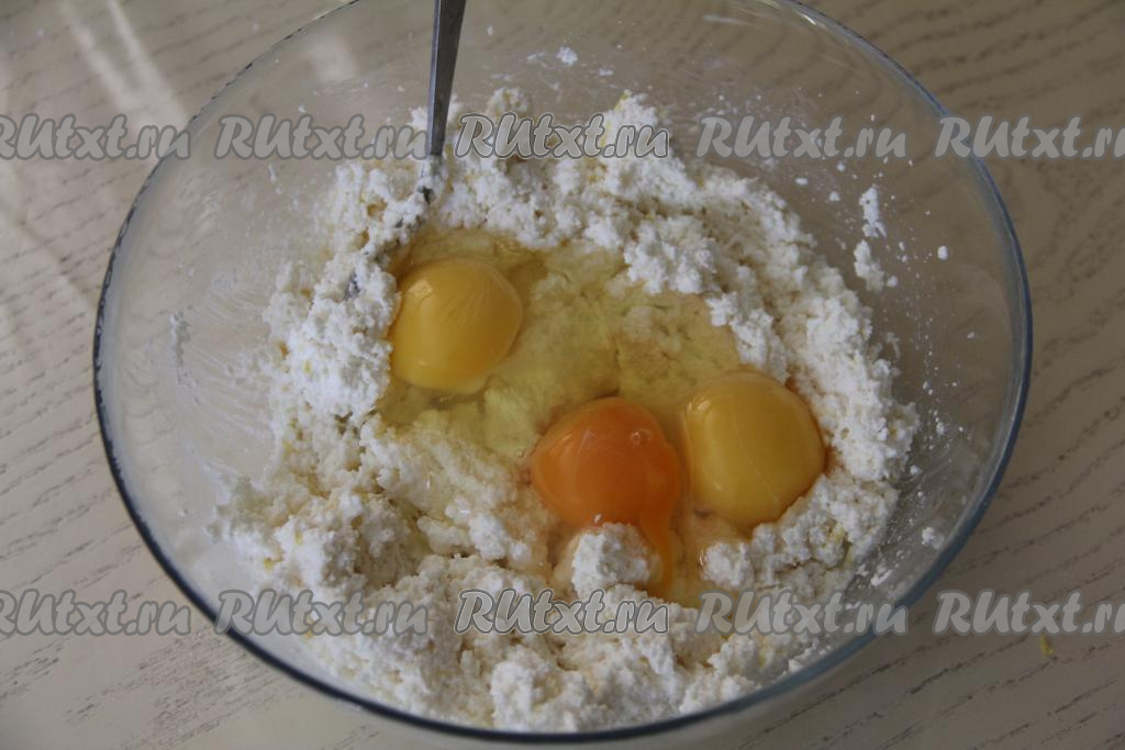 Вбить в творожную начинку сырые яйца. Перемешать начинку до однородности, она получится негустой.