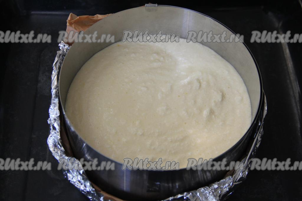 В разъёмную форму диаметром 22 сантиметра равномерно выложить половину теста-крошки, утрамбовать.