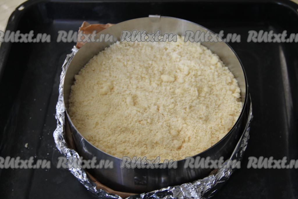 В качестве формы я взяла разъёмное кулинарное кольцо диаметром 22 сантиметра, дно сформировала из пергамента и фольги, сложенной в несколько слоёв. Разместила подготовленное кольцо на противне, а затем уже выложила половину теста-крошки.