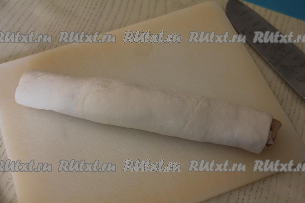 Свернуть тесто в плотный рулет, начиная с длинной стороны теста.