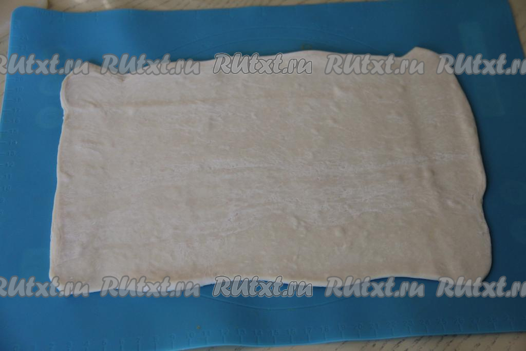 Пласт теста на присыпанной мукой поверхности раскатать в прямоугольник толщиной примерно 3 миллиметра.