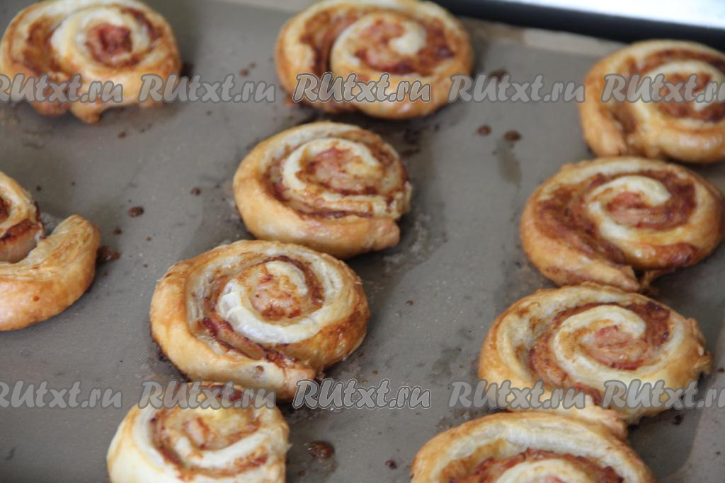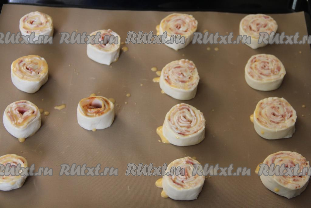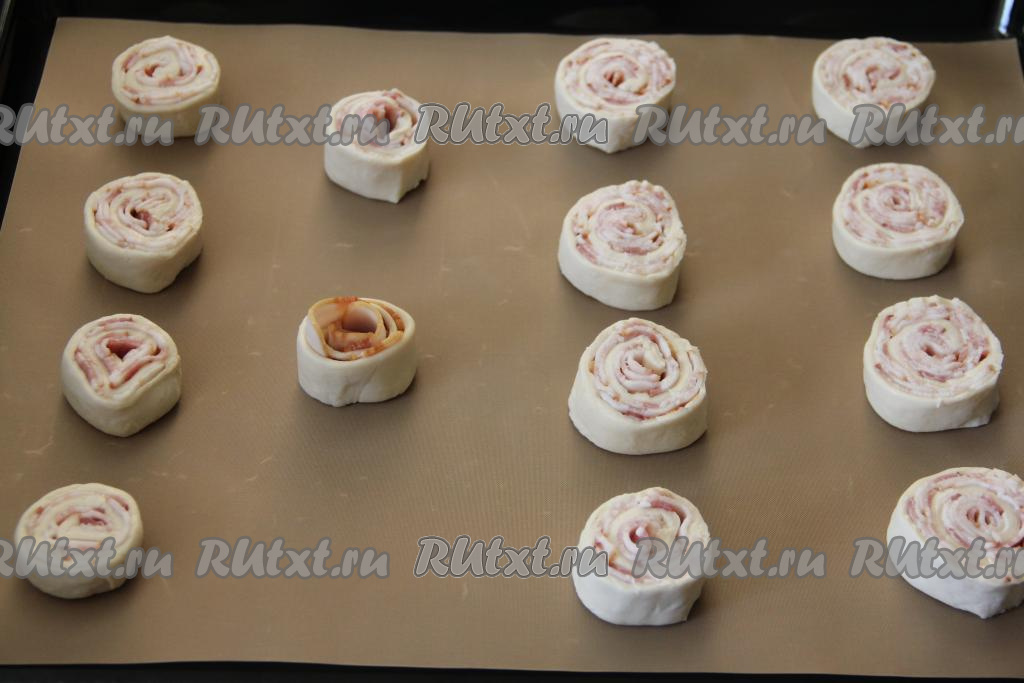 Рулетики с беконом выпекать минут 15-20 (до золотистого цвета слоёного теста).