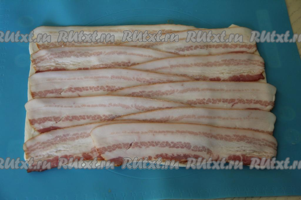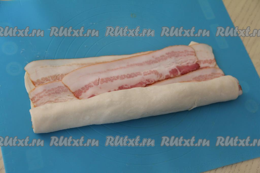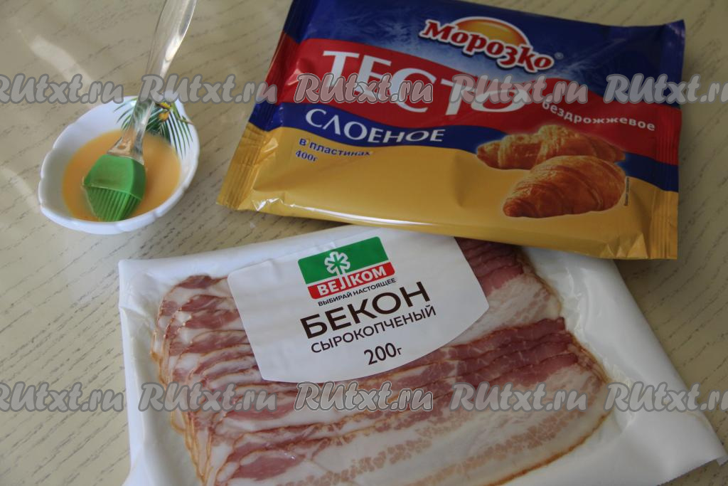 Подготовить продукты. Разморозить слоёное тесто (подойдёт как дрожжевое, так и бездрожжевое покупное слоёное тесто) при комнатной температуре. Бекон я взяла сырокопчёный, уже нарезанный на полоски.