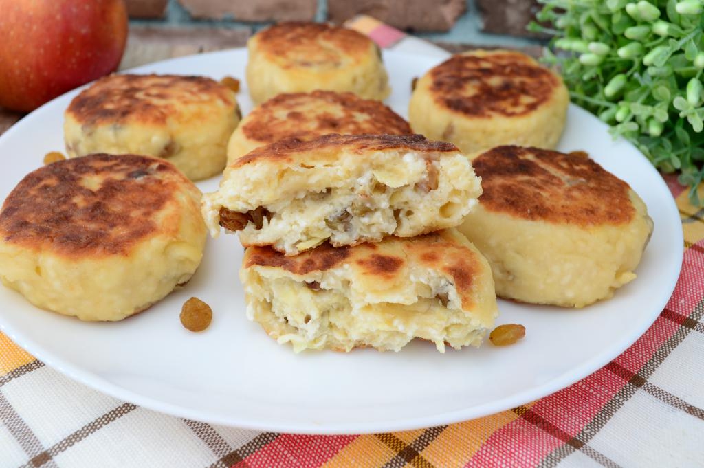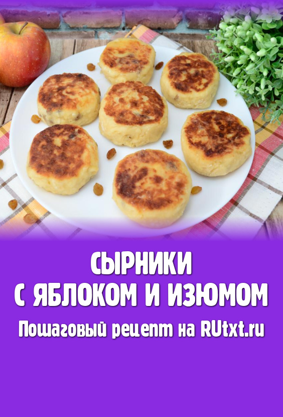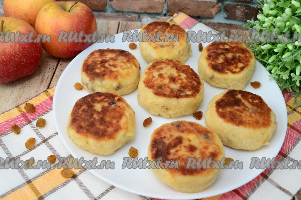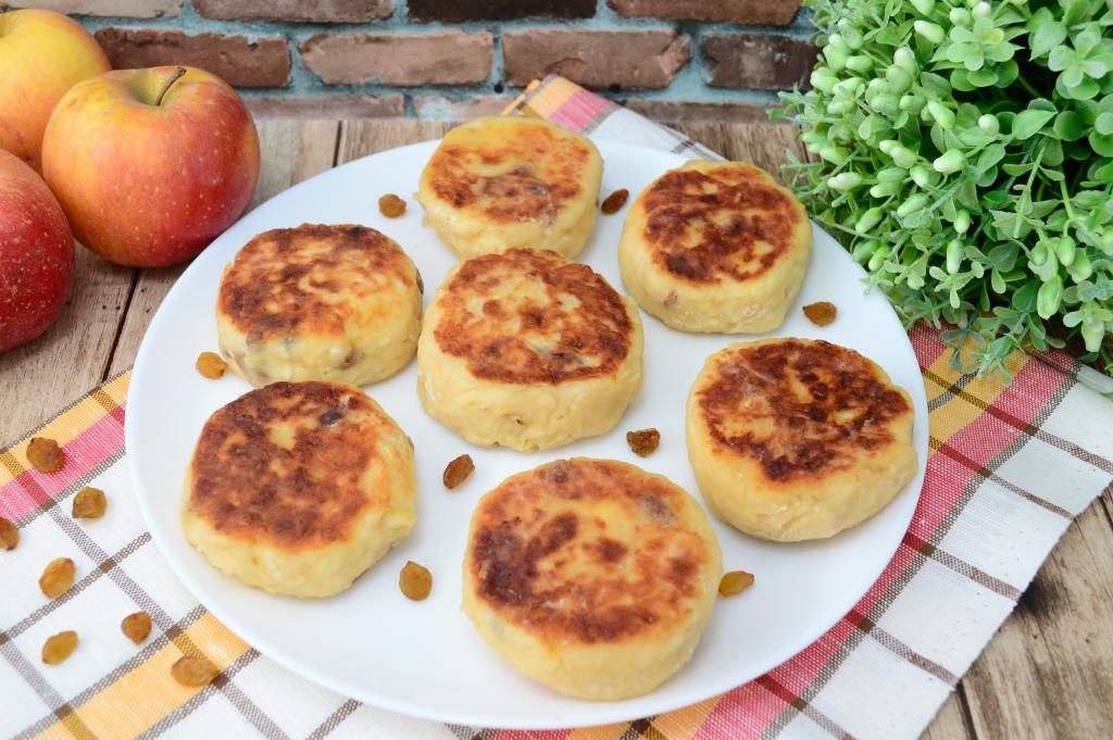 А затем пышные, нежные сырники, приготовленные с яблоком и изюмом, можно подавать к столу. Они вкусны и в горячем, и в остывшем виде.